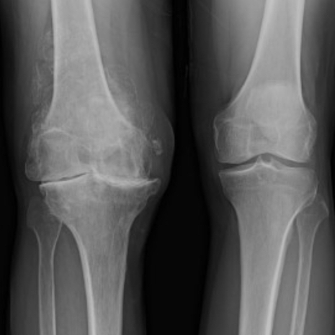 You can see that there is no gap between the bones of the knee on the left of the image. This indicates the articular cartilage and meniscus have completely worn away causing arthritis and the ends of the bones to rub. This is a painful condition.