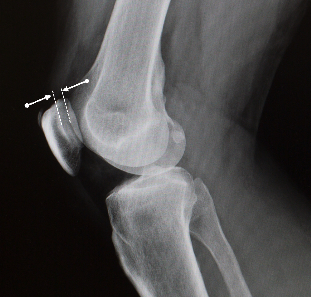between the patella and femur, meaning the articular cartilage still has a healthy thickness. A narrowing of this gap would indicate